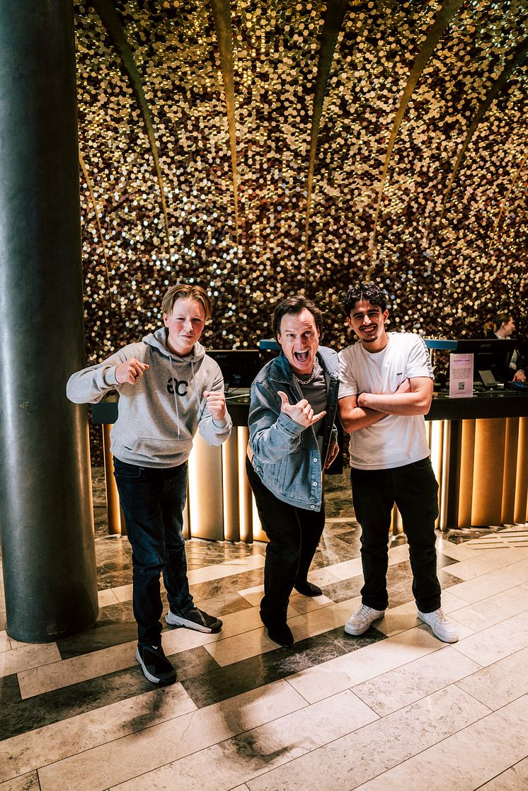 Petter A. Stordalen sammen med Eliah og Mohamed. Begge guttene har deltatt på Guttas Campus, fått arbeidstrening i Strawberry, og nå deltidsjobb på hvert sitt hotell.