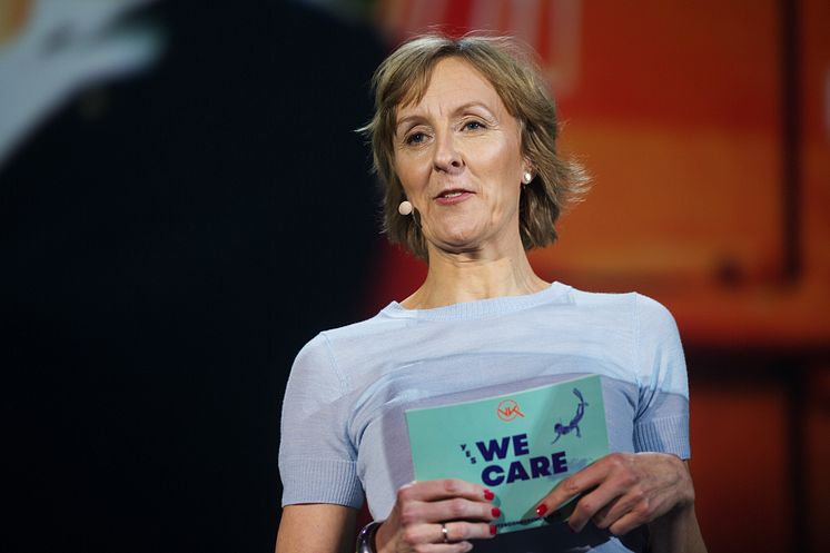 YES, WE CARE: Cathrine Dehli, direktør for bærekraft i Nordic Choice Hotels, på scenen under årets vinterkonferanse.