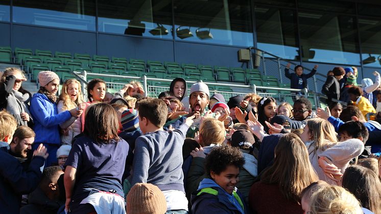 Kash King deler ut insektssnacks til elevene, som mer enn gjerne ville smake.